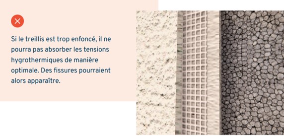 - Le treillis d’armature, quant à lui, est une trame en fibre de verre résistante aux alcalis, intégré dans cette couche d’enduit afin d'absorber les contraintes thermiques dans celle-ci.