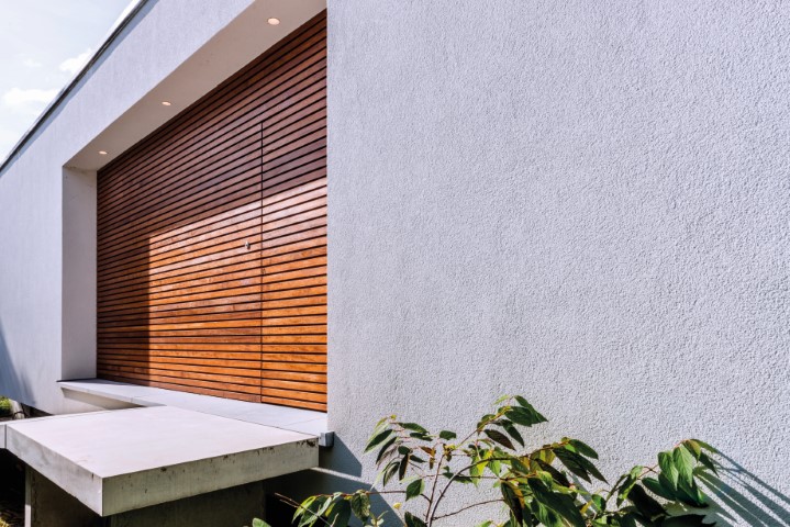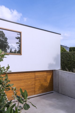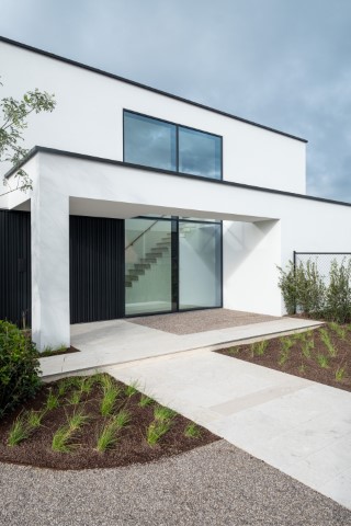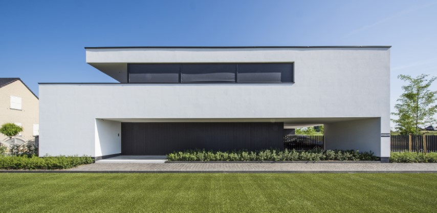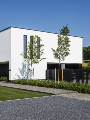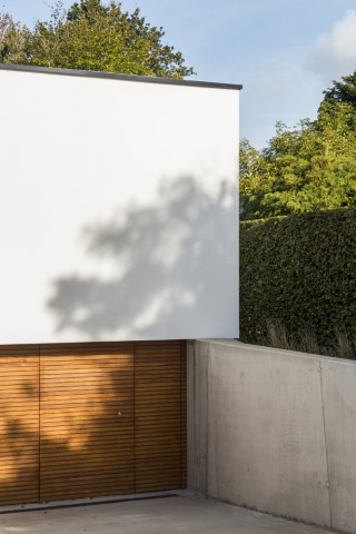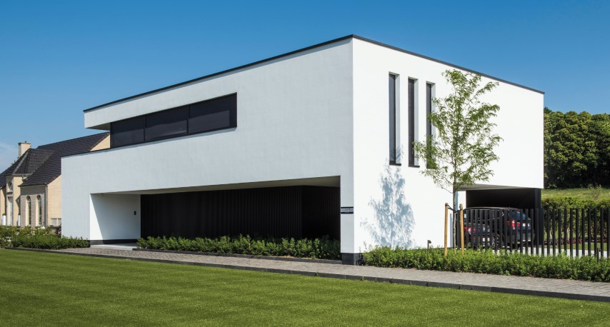 Voor dit project in Mariakerke creëerde architect Firmin Mees uit Oudenaarde een moderne en strakke uitstraling, zonder bakstenen, voegen of vensterbanken – een uniform geheel zonder opvallende elementen. De woning werd geïsoleerd met 20 cm polystyreen, afgewerkt met een pleisterlaag. Het lijkt te zweven boven de grond door het contrast met het houtwerk aan de onderzijde, dat fraai samenkomt met het witte pleisterwerk en doorloopt in de carport voor het huis.