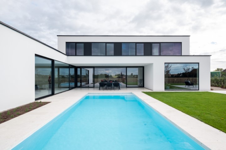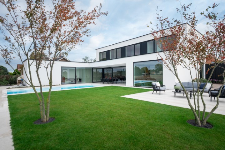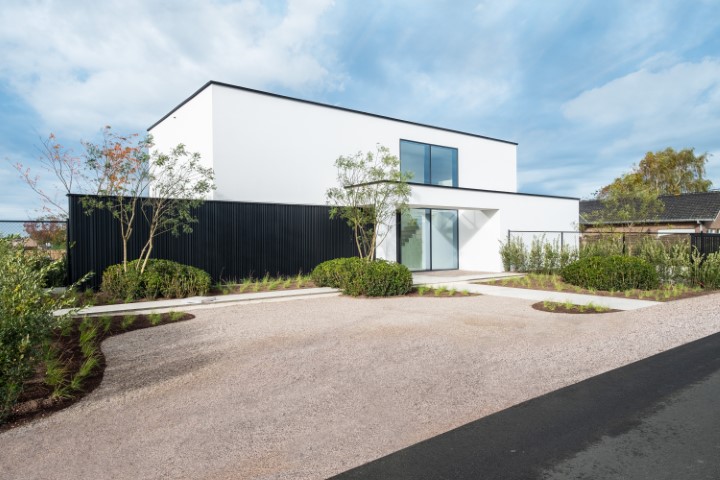 In het landelijke Ledegem werd deze hedendaagse woning gebouwd die imponeert. De vormgeving vertrouwden de eigenaren toe aan SheCi.be architecten. De buitengevel oogt eerder sober met een vrij gesloten voorgevel in witte crepi, gecombineerd met een tuinmuur in zwarte aluminium gevelbekleding, het klassiek zwart-witverhaal. Centraal krijgen we wel een inkijk dankzij een grote raampartij die over de twee verdiepingen loopt. Met de luifel ervoor krijg je een uitnodiging tot de woning. SheCi.be architecten: “We wilden een woning die licht en ruimte ademt en aan de buitenzijde vooral rust en harmonie uitstraalt.” Missie geslaagd.